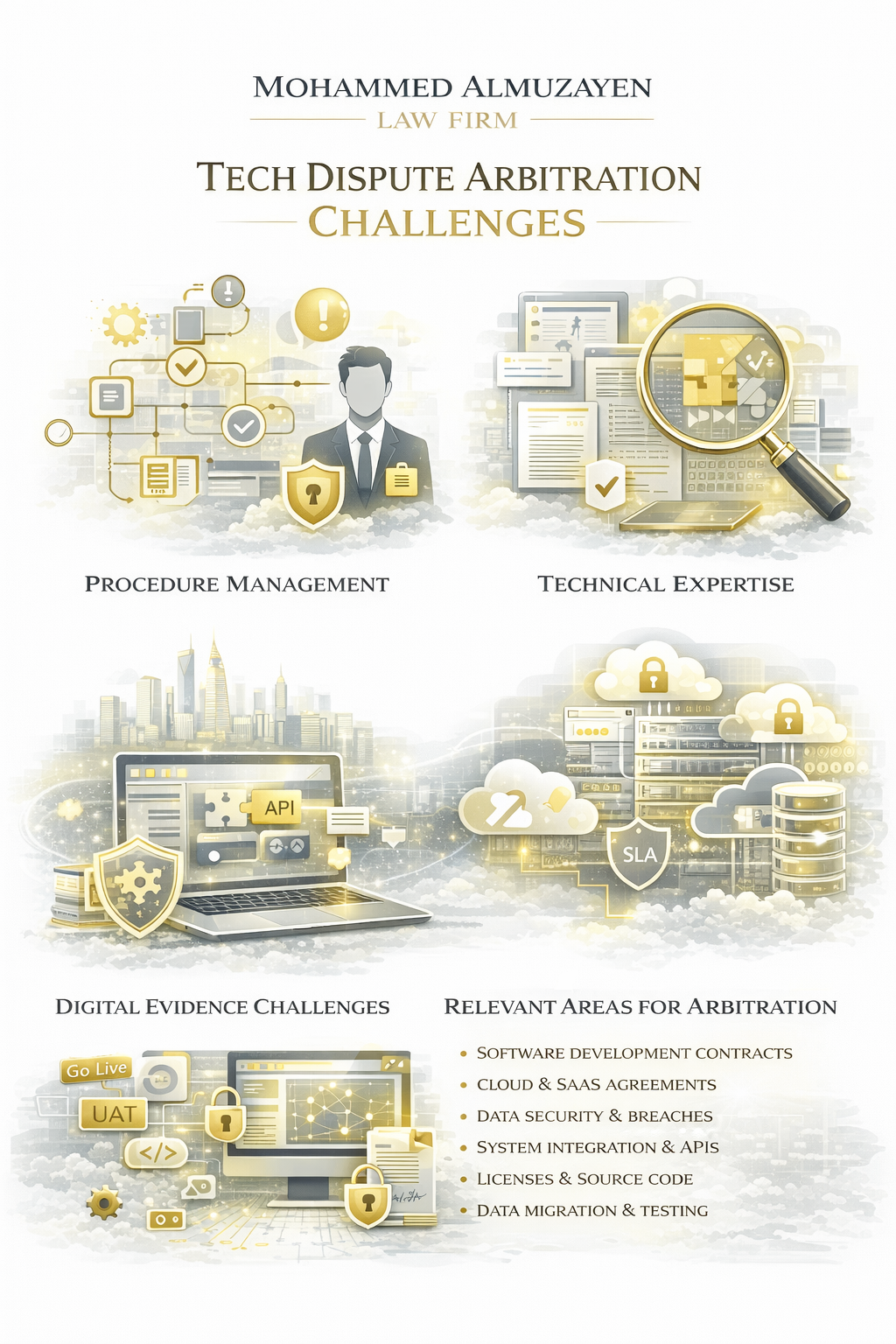 إذا كنت تبحث عن محكّم لإدارة نزاع تقني مرتبط بـ عقود تطوير البرمجيات وتسلّم الأنظمة (UAT/Go-Live)، أو نزاعات تنفيذ مشاريع التحول الرقمي (ERP/CRM)، أو الخلافات حول التكامل بين الأنظمة (System Integration) وواجهات الربط (APIs)، أو نزاعات الحوسبة السحابية (SaaS/Cloud) ومستويات الخدمة (SLA) والانقطاعات، أو نزاعات الأمن السيبراني وتسرب البيانات ومسؤولية الإخطار، أو النزاعات المتعلقة بملكية الكود المصدري وحقوق الاستخدام والترخيص (Licensing/IP)، أو الخلاف حول جودة البيانات وترحيلها (Data Migration) ومعايير الأداء والاختبار؛ فإننا في محمد المزين للمحاماة والتحكيم على استعداد لتولي دور المحكّم الفرد أو عضو هيئة تحكيم ثلاثية أو رئيس هيئة تحكيم—بحسب شرط التحكيم وطبيعة النزاع التقني.